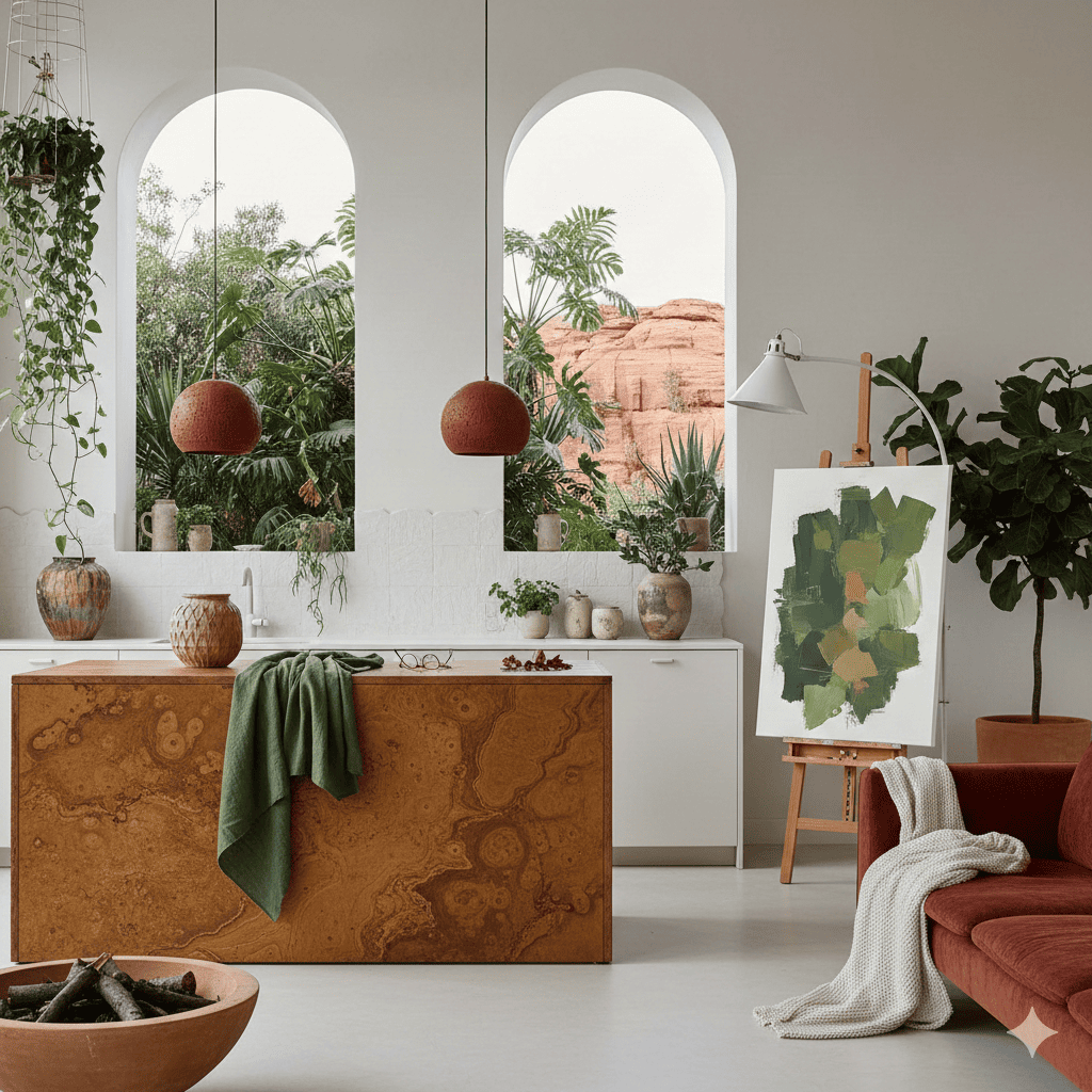 Vegetación Interior: Plantas de hojas grandes (como la Monstera o el Ficus Lyrata) que contrasten con los tonos neutros de tus muros.