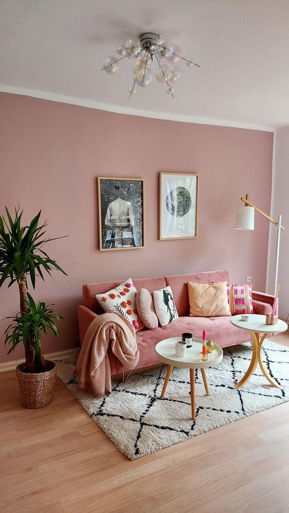 El rosa en su gama fuerte va genial acompañado con maderas oscuras, acentúa el color, especial atención en pequeñas salas, gama que necesita de amplitud e iluminación natural. Suaviza la intensidad con los blancos.